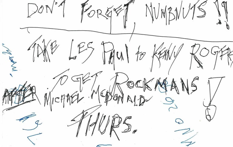 We got to Lion Share about 11:00 p.m., and the guy with the “Rockmans” was there and begged Les to sign his guitar, which Les did. We sat in the studio for hours talking, Les eating popcorn. Finally, I got up, grabbed Les’ bag of popcorn, and made a trail of popcorn on the ground heading for the door. I said, “Come on, Les, let’s go,” trying to bribe him to leave. It was 3:00 a.m. Les called me a dirty name but got up, and we left.