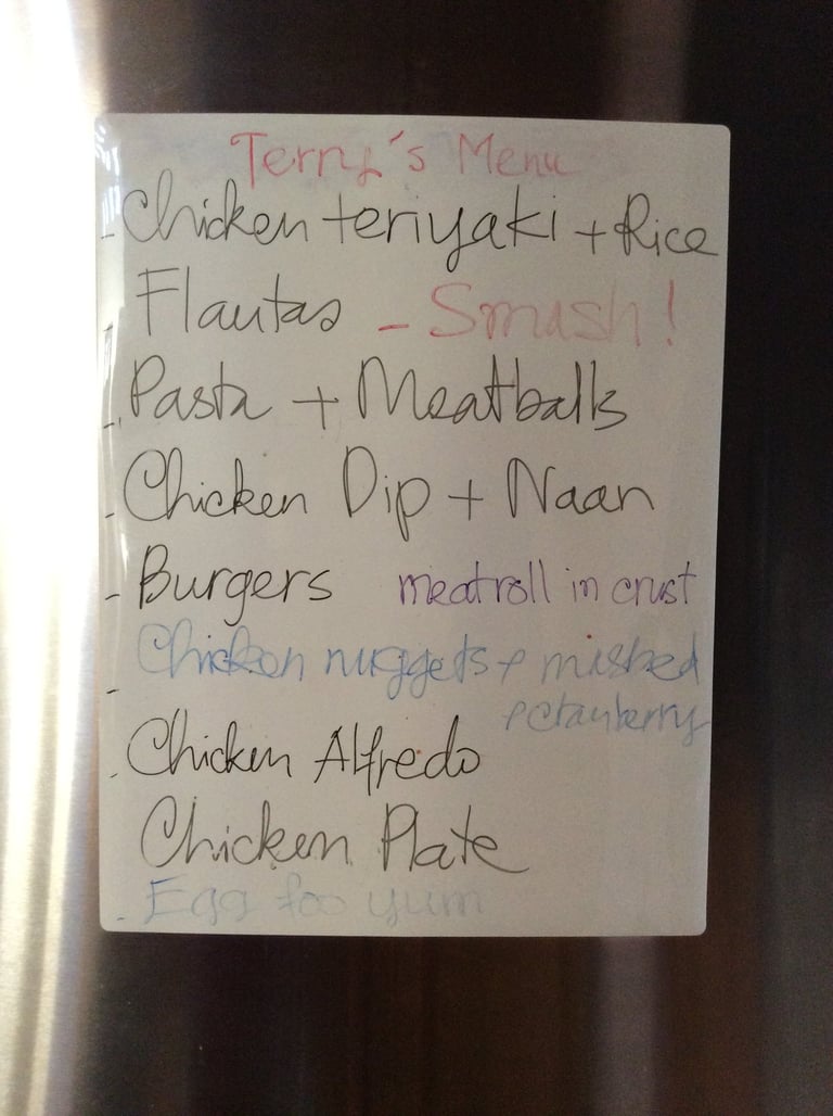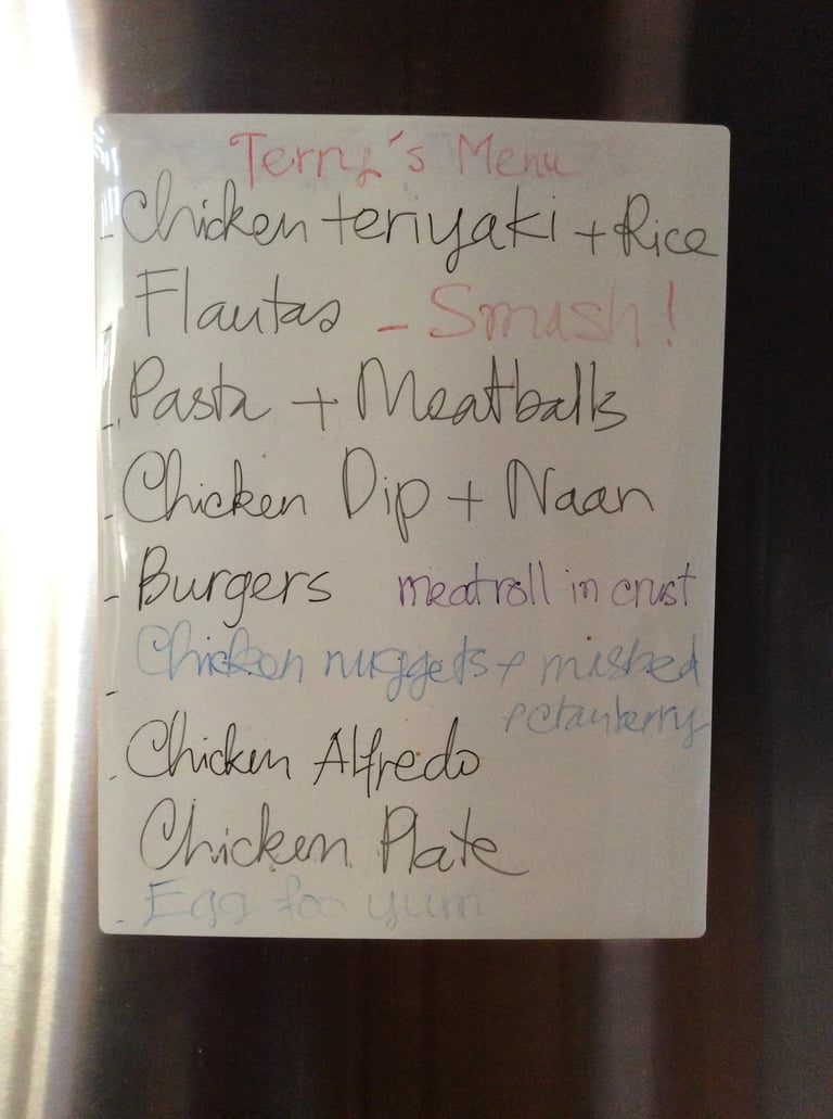 On the fridge, there is still a menu. Terry’s menu. Written in marker. Smudged. Familiar. Chicken teriyaki and rice. Flautas. Pasta and meatballs. Burgers. Chicken Alfredo. Not fancy. Not impressive.